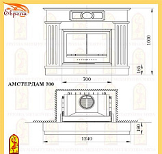 Предтопочная и надтопочная часть выложена шамотом песочно-жёлтого цвета. Каминная балка изготовленная из МДФ и покрытая шпоном дуба, послужит отличной полкой для каминных аксессуаров, таких как часы, канделябры, рамки с фотографиями и др. В нижней части облицовки расположена удобная ниша для хранения и сушки дров.